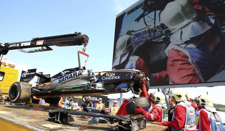 Veľká cena Maďarska sa blíži, no predtým sa na trati Hungaroringu musia piloti trocha zahriať a pobiť o konečné umiestnenie na štarte. Dnešný prvý meraný tréning však poznačil spočiatku nevinne vyzerajúca havária mexického pilota Sergia Pereza zo stajne Force India. Ten vyšiel z jedenj zo zákrut v príliš vysokej rýchlosti. Dostal sa do rovinky, kde sa snažil prevziať kontrolu nad vozidlom. To sa mu však nepodarilo a narazil do zvodidiel, ktoré ho vyrazili späť na trať, kde sa monopostu odlomilo