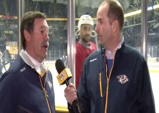 Americký útočník Winnipegu Jets Dustin Byfuglien mal počas tréningu na ľade Nashvillu dobrú náladu a pri jednom z rozhovorov súpera robil dokonalú kulisu.