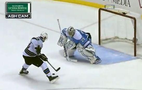 Brankár Pittsburghu Penguins Marc-Andre Fleury sa vyznamenal famóznym zákrokom, keď lapačkou vymazal tutovku Patricka Marleaua zo San Jose Sharks.