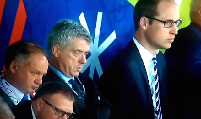 Britský princ William v čestnej lóži na tribúne po ľavej ruke, slovenský prezident Andrej Kiska z druhej strany - dočasnému prezidentovi Európskej futbalovej únie (UEFA) Ángelovi Maríovi Villarovi zo Španielska to nebránilo, aby si počas pondelňajšieho stretnutia SR - Anglicko (0:0) v St. Étienne v základnej B-skupine na futbalových ME vo Francúzsku zdriemol.