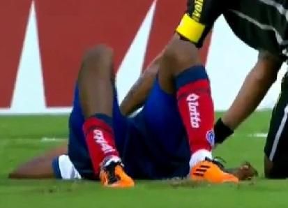 Útočník brazílskeho futbalového klubu Bahia - Maranhao netrafil loptu a odniesla si to jeho ruka...