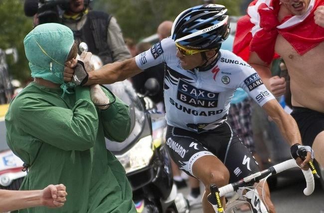 Španielsky cyklista Alberto Contador na tohtoročnej Tour de France bojuje predovšetkým o získanie prestíže a svojho mena po tom, čo ho poškodil kontroverzný dopingový škandál z minulého roka. V 19. etape sa v kopcoch pustil do dlhého úniku, sám tak musel znášať preafektovaných a otravných fanúšikov, ktorí mu doslova hatali cestu. Medzi nimi sa objavil aj jeden jasný neprajník oblečený v zelenom operačnom plášti, zamaskovaný čiapkou a svojou gestikuláciou sa Contadorovi snažil pripomenúť doping z vlaňajška. Španiel sa s ním vôbec nehral a odstavil ho päsťou.
