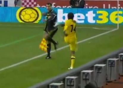 Izraelský obranca v službách Maccabi Tel Aviv, Yoav Ziv hviezdil v súboji so Stoke City , keď.na čiarového rozhodcu odpálil kopačku. To bol však jeho posledný vtipný kúsok v zápase...