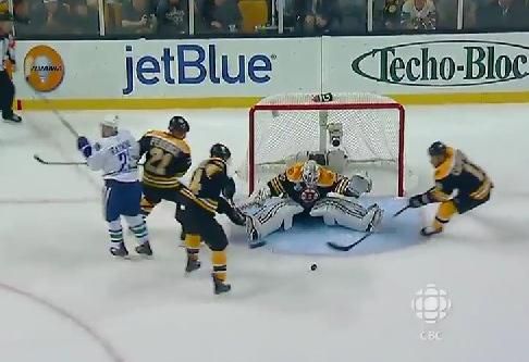 Tim Thomas v treťom súboji finále o Stanley Cup ponúkol domácim fanúšikom množstvo fantastických zákrokov. Po prvej tretine tak zostal smutný aj Mason Raymond z Vancouveru...