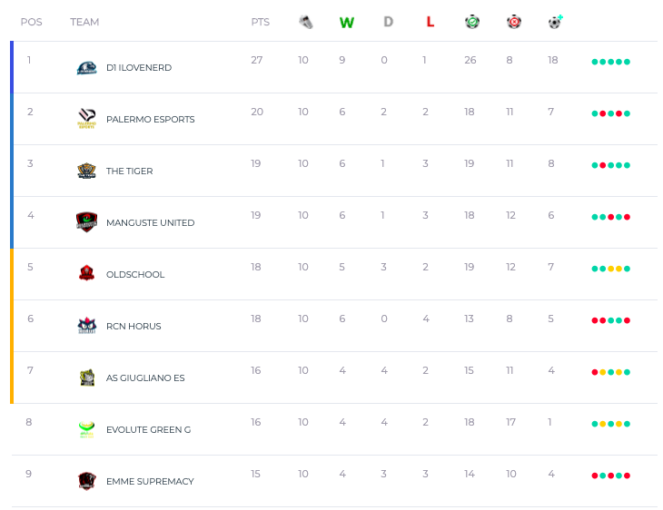 D1 dominuje talianskej lige. Suverenitu môžeme pokojne porovnať s PSG vo francúzskej, či Liverpoolu v anglickej lige. Zaváhal jedine v 3. kole nad 16. celkom. V 9. kole zdolal vtedy tretí Palermo a problém nemal ani so šiestym Horusom. Ligu tak vedie už so 7-bodovým náskokom. Vylepšenie 3. miesta z predošlej sezóny tak vyzerá reálne. Darí sa im aj v eEurópskej lige, 2 výhry z 2 a rovnako v eCoppa Italia 3 výhry z 3. Famózny ročník chce po Palerme potvrdiť aj pri Tigroch z 3. miesta.