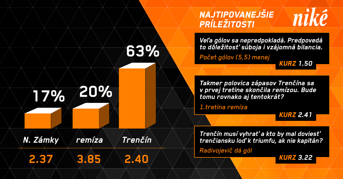Zaujímavou štatistikou je, že všetky štyri doterajšie vzájomné stretnutia v sezóne vyhrali Nové Zámky v riadnom hracom čase. Navyše Trenčín je vonku výrazne slabší ako doma, keď na ľadoch súperov patrí medzi najslabšie mužstvá. Aj napriek uvedeným faktom o niečo viac veríme Trenčanom, ktorých hráči majú viac skúseností z náročných zápasov.