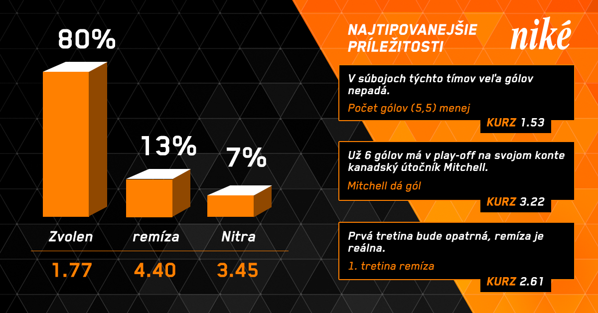 Nitra po víťazstve v piatom semifinálovom súboji na ľade Zvolena viedla v sérii 3:2, no Zvolenčania následne v Nitre uspeli 4:1 a výhoda domáceho prostredia bude v rozhodujúcom stretnutí na ich strane. Viacerých hráčov Nitry trápia zdravotné problémy a predpokladáme, že Nitra záver namáhavej série nezvládne...