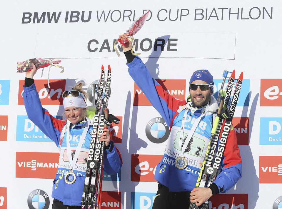 Francúzska dvojica biatlonistov Martin Fourcade, Marie Dorinová-Habertová triumfovala v nedeľňajších pretekoch zmiešaných štafiet jednotlivcov v rámci podujatia 7. kola Svetového pohára v kanadskom stredisku Canmore.