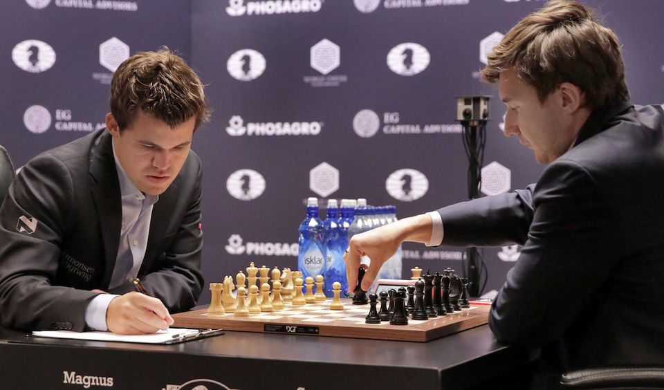 Magnus Carlsen (Nór.) - Sergej Karjakin (Rus.) 0,5:0,5