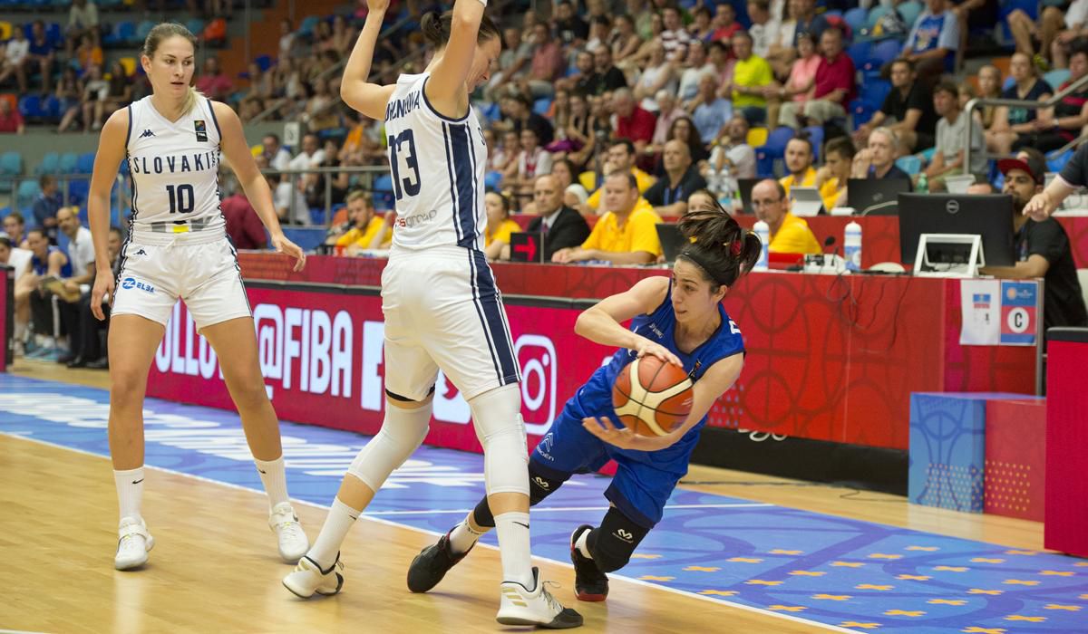 V zostave Slovenska už chýbala Páleníková, pre ktorú sa z dôvodu zranenia členka turnaj skončil. Úvodná štvrtina bola vyrovnaná, družstvá sa striedali vo vedení. Kapitánka SR Žirková síce nastúpila v základnej päťke, ale na jej hre bolo vidieť, že ju limituje boľavé koleno. Kouč Svoboda ju tak stiahol z palubovky a šancu dal aj 18-ročnej Kováčikovej, pre ktorú to bol debut na ME. Slovenky v prvej časti hry výrazne trápila streľba, keď z hry premenili len tri z 13 pokusov. Aj preto prehrali prvú periódu 12:16.