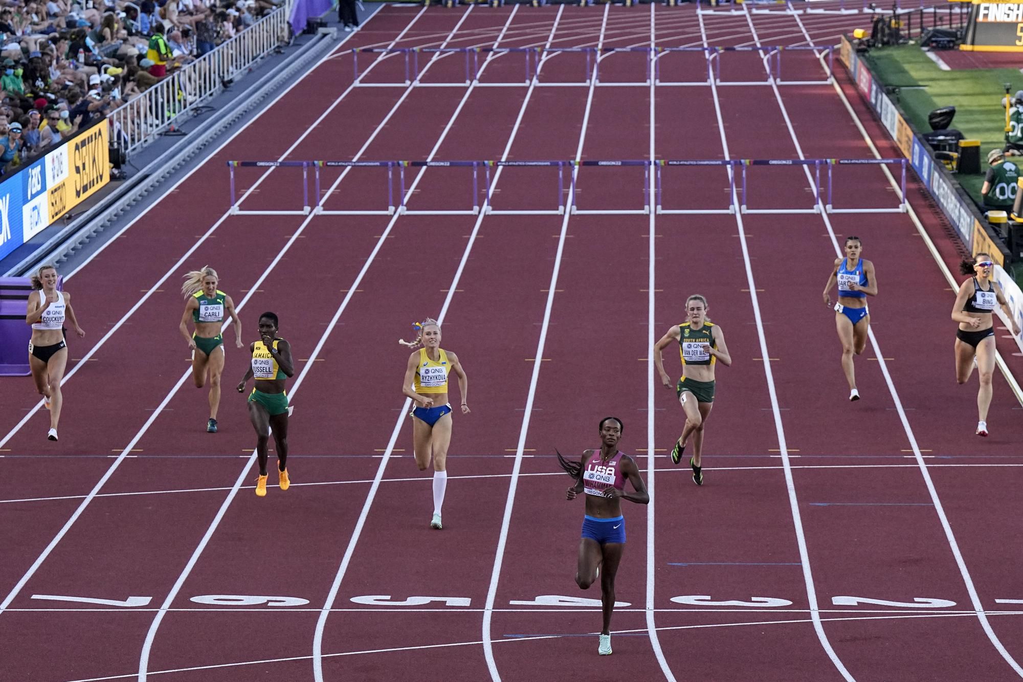 400 m prek., semifinále, ženy: Svetová rekordérka a olympijská víťazka Sydney McLaughlinová s ľahkosťou zabehla najlepší nefinálový čas histórie atletiky 52,17. Vôbec ôsmy výkon všetkých čias. Vo finále bude atakovať vlastný svetový rekord.