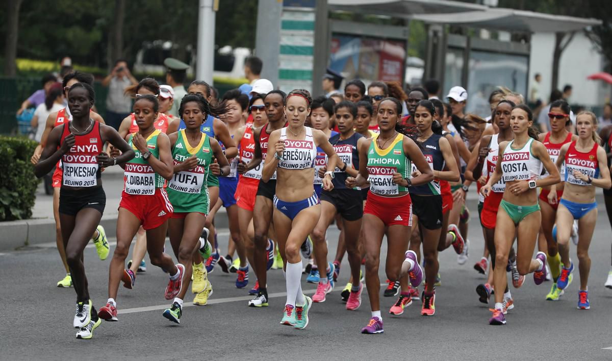 Na 10. km (35:32) mali najpočetnejšie zastúpenie v 18-člennom 'balíku' štyri Keňanky, tri Etiópčanky a tri Japonky. Na 15. km (53:21) bolo v popredí 19 vytrvalkýň a hneď za nimi ukrajovala kilometre Katarína Berešová s polminútovou stratou. Najväčšiu aktivitu vyžarovali Japonky, Etiópčanky a aj Kim Hye-Song z KĽDR, 8. na MS v Moskve.