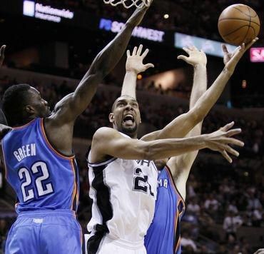 Najviac bodov: T. Parker 20, Neal 19, Duncan 17 (10 doskokov) - Durant 30, Westbrook 25, Harden 16