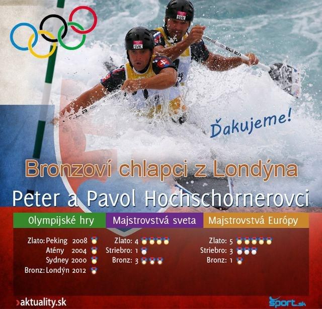 Vodní slalomári bratia Peter a Pavol Hochschornerovci získali pre Slovensko na olympiáde v Londýne tretiu medailu a tretí krát je bronzová.