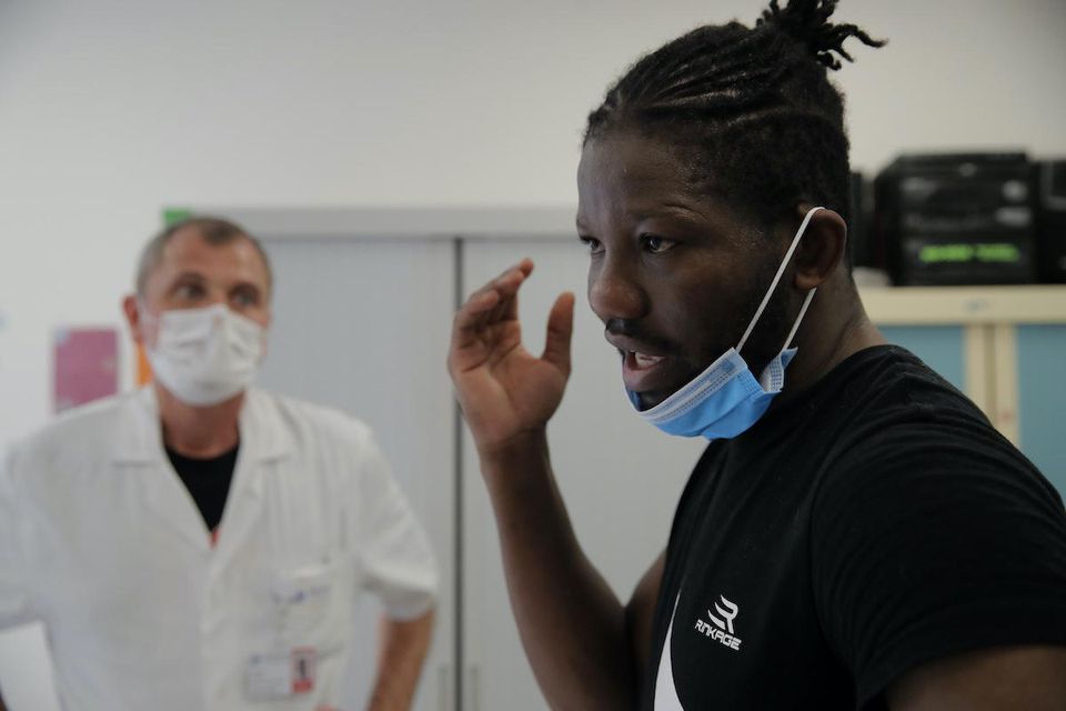 Kamerunský profesionálny boxer Hassan N'Dam poskytol zamestnancom nemocnice vo francúzskom meste Villeneuve-Saint-Georges lekcie svojho umenia.