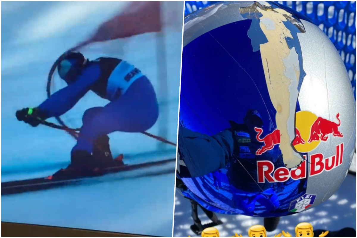 Do cieľa sa nepodarilo prísť ani druhému lyžiarovi. Talian Dominik Paris hlavou narazil do tyče jednej z bránok, čo ho tak vyhodilo z rovnováhy a otriaslo s ním, že radšej zišiel z trate. Po pretekoch na Instagram pridal fotku svojej rozbitej prilby.