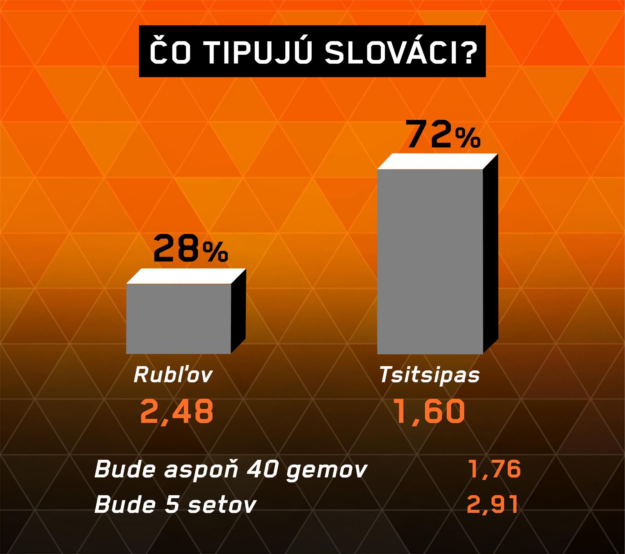 Väčší tlak bude vyvíjaný na Tsitsipasa, ibaže ak sa chce nazývať veľkým hráčom, musí sa s ním vedieť vyrovnať. Duel s Rubľovom bude dlhý, možno až maratónsky, ale Grék vyrovná vzájomnú bilanciu na 3:3.