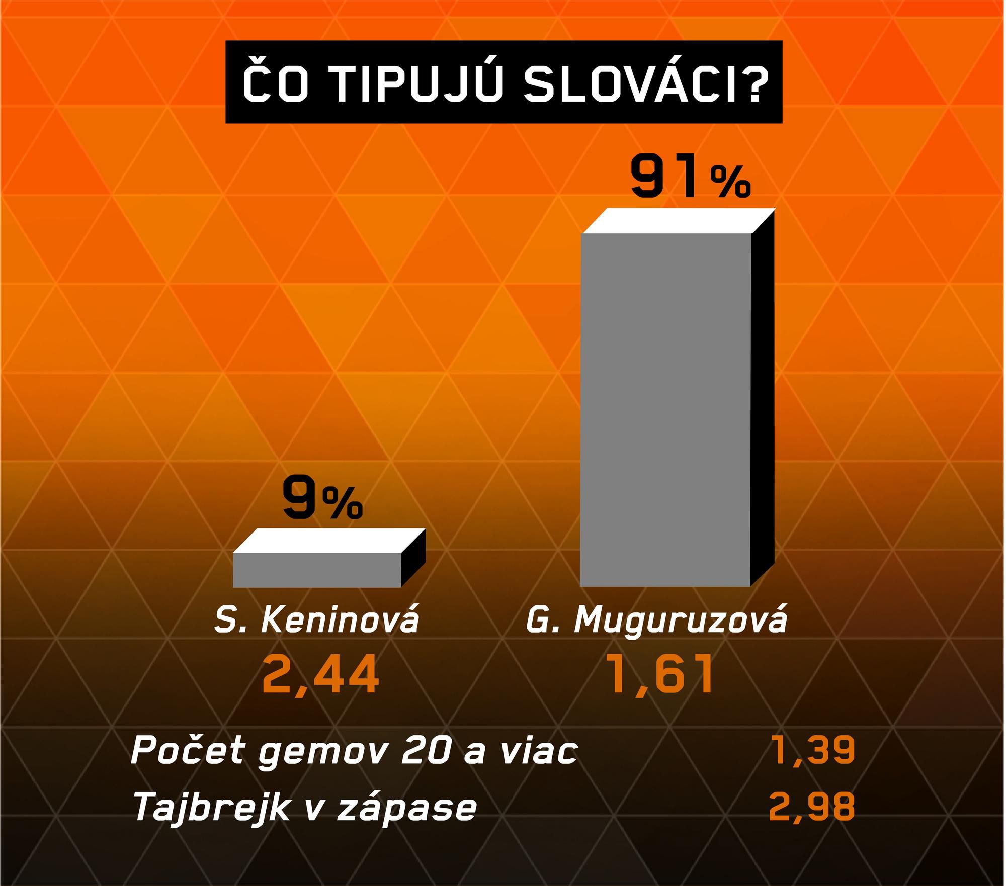 Očakáva sa veľmi vyrovnaný zápas, rozhodnú maličkosti. Víťazka bude musieť byť odvážna, trúfať si na víťazné údery a robiť čo najmenej nevynútených chýb. Tlak bude na Muguruzovej, ale myslím si, že ho ustojí a vyhrá 2:1 na sety.