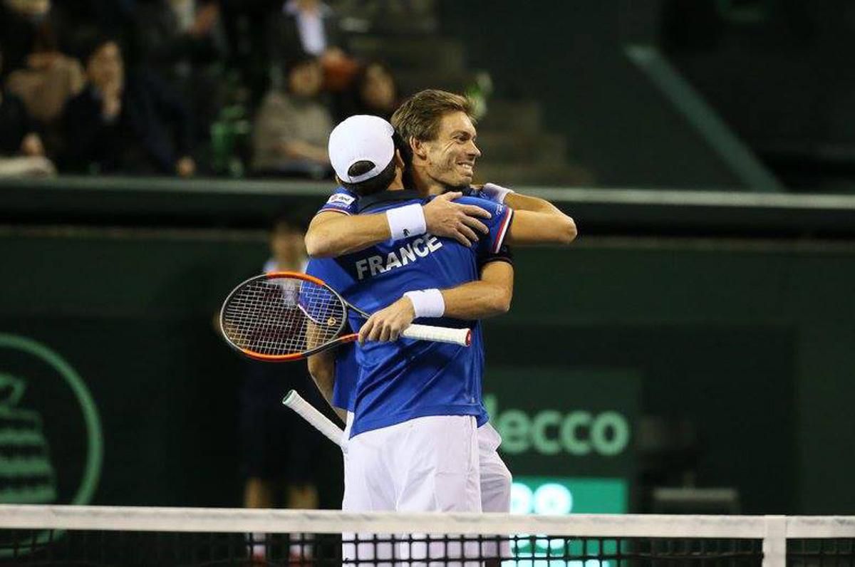 Krajine galského kohúta utvorili v Tokiu proti Japoncom bez grandslamového finalistu Kei Nišikoriho nádejnú pozíciu pred víkendom Richard Gasquet a Gilles Simon víťazstvami nad Tarom Danielom a Jošihitom Nišiokom. Takisto bez straty čo i len setu potom zabrali renomovaní deblisti Pierre-Hugues Herbert a Nicolas Mahut proti tandemu Juiči Sugita, Jasutaka Učijama - 6:3, 6:4, 6:4.
